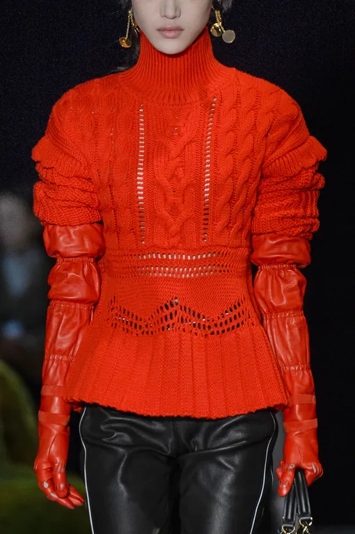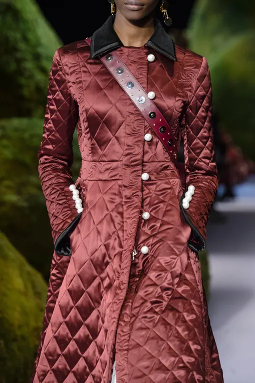 По нему перед зрителями продефилировали четыре десятка леди Макбет с бледными по-средневековому лицами. Все от и до — в стеганых атласных пальто цвета спелого граната, кейпах с узорными петлями, норковых шубах и пелеринах, расшитых жемчугом и бархатных жакетах с имитацией корсетной шнуровки в качестве декора и съемными басками на ремнях. А еще — в длинных перчатках, на которые дизайнер перенес характерные для рукавов исторического костюма той эпохи буфы, и в цветочных платьях, покрытых обильной тяжелой вышивкой.