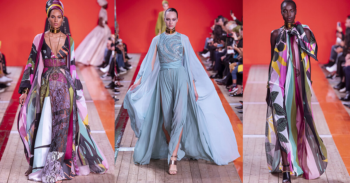 Вдохновением для Сааба на этот раз стали путешествия по жарким странами. Поэтому даже в его парадно-вечернюю коллекцию ненавязчиво прокрался стиль сафари: некоторые платья и костюмы очевидно вдохновлены традиционными нарядами искателей приключений. В других случаях в игру вступают принты и краски, как будто подсмотренные дизайнером на локальных рынках — некоторые вечерние платья словно сшиты из красочных национальных платков. Но и вечная классика тоже на месте: пайетки, стеклярус и пышные банты не сдают позиций.