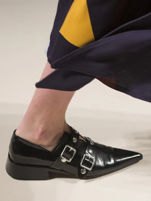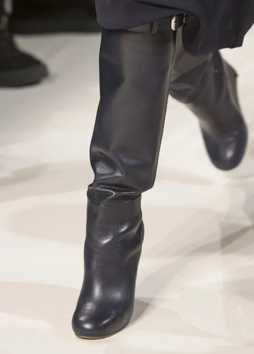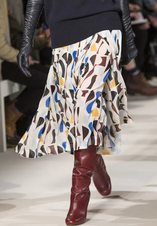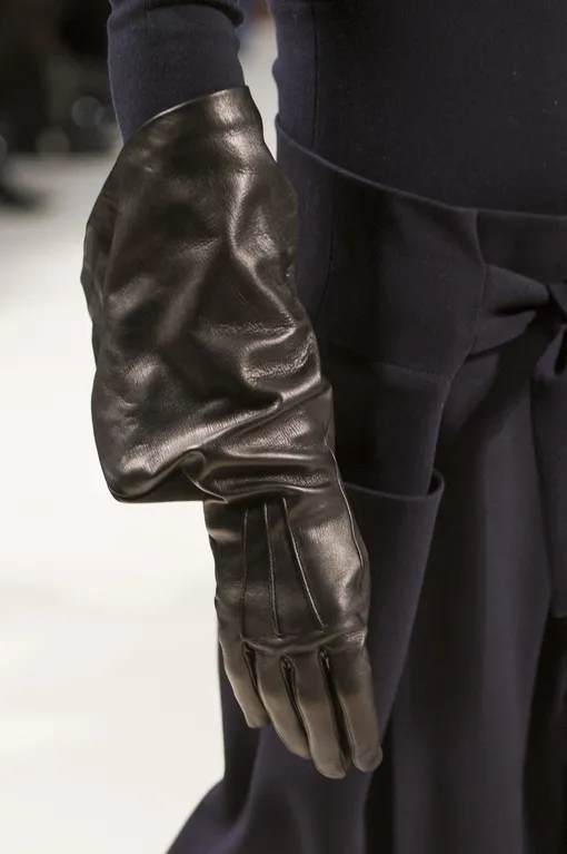 Все, что ниже линии талии, становится территорией для игры с объемами и слоями. Здесь юбка-полусолнце выглядывает из-под удлиненного жакета и блузы, широкие брюки — из-под платья, пенятся многоярусные оборки, на запястьях собираются складкой длинные кожаные перчатки, а на лодыжках — аналогично сапоги с прямым голенищем.