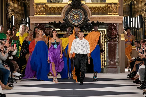 В весенней коллекции Balmain креативный директор Оливье Рустен практически полностью отказался от того, что в последние годы прочно прописалось в ДНК марки: богатого, чрезмерного, вызывающе роскошного декора. И вместо этого заполнил излюбленные силуэты принтами, основанными на оптических иллюзиях и простейшей геометрии. По вещам разбежались круги и клетки, полоски и треугольники — все наслаивается друг на друга, переплетается, искажается и складывается в новые формы, так что у самых хрупких зрителей после этого шоу наверняка головы пошли кругом. Иногда просто принтов и фигурных вырезов Рустену оказывалось мало — и тогда он решил превратить в геометрические фигуры самих моделей. Так появились, например, асимметричные костюмы с одной штаниной и одним рукавом, превращающие девушек в прямоугольники на тонких ножках. Или такие же массивные прямоугольные жакеты. Не все вещи из этой геометрической линейки были удачны, но попадались в черно-белом массиве и практически шедевры — вроде плечистого топа с узором из кругов и аккуратным логотипом Balmain.