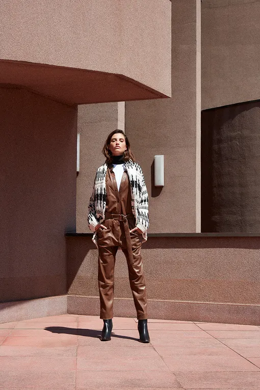 В этом сезоне кожаные вещи правят бал. Выбирайте комбинезон карамельного оттенка, юбку с асимметричным подолом или брюки-бананы, а лучше — все вместе. И обязательно миксуйте с вязаными вещами — лучшего сочетания не придумать.