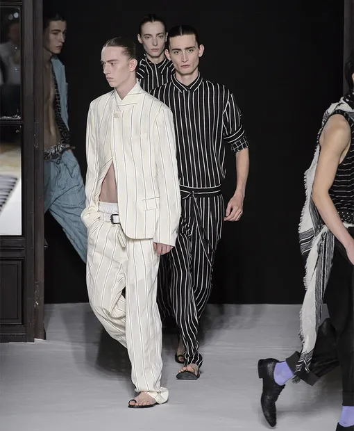 Новую мужскую весенне-летнюю коллекцию 2018 Хайдер Акерманн выстроил по принципу следования от порядка к хаосу. Вначале следовал строгой геометрии в духе стилистики ар-деко, поддержав тему 1920-х любимыми полосатыми пижамами, шелковыми халатами в пол и напомаженными проборами, но потом все-таки дал волю своей фирменной деконструкции, ломаным линиям и вещам-абсурдам, — дутым, перевернутым, недошитым - ради которых тут все и собрались. Для легкости считывания идеи - все в черном и белом цвете. Ну почти все. Смотрим, как побеждает праздный декаданс.