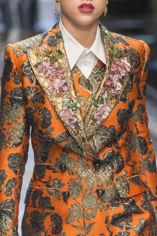 Объединяя в коллекции из сотни луков все, за что дизайнеров так любят обожающие быть в центре внимания звездные покупатели, Dolce & Gabbana заманивает своих юных поклонников в тропическую чащу красочным гардеробом, в котором смешаны леопардовые и цветочные принты, черное и белое кружево, барокко и рококо, деним, которого, впрочем, и не видно за многоэтажным бряцающим декором из ярусов бахромы, стекляруса, аппликаций и вышивок, а также аналогично декорированные мундиры и цветочно-фруктовые короны и тюрбаны. В традиционном для марки декоре представлены не только знаковые элегантные жакеты с круглым вырезом, платья по фигуре, шелковые пижамы в цветах и кошках, юбки-карандаши и юбки солнце, но и ориентированные на уличных трендсеттеров сегодняшнего дня худи, бомберы, тенниски, объемные блестящие пальто-халаты, пижамы и тренировочные костюмы.