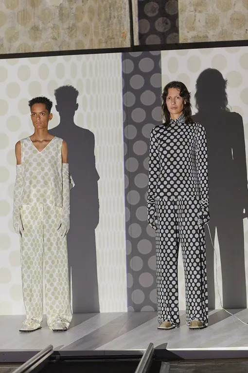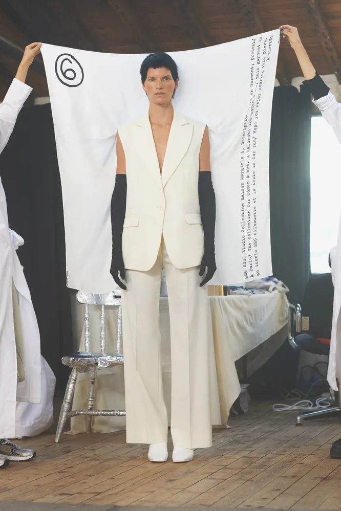 В данном случае задача осложняется еще и тем, что речь идет о второй линии, которая всегда имеет более простой, прикладной и понятный характер. Не скатываться при таком наборе характеристик в примитивизм и придерживаться единой со старшей линейкой стилистической канвы обычно очень непросто. Тем не менее, у команды MM6 это получилось. Настолько, что в какой-то момент можно было даже подумать, что сам Мартан Маржела ненадолго вернулся в моду, чтобы сделать эту коллекцию. Она полностью пропитана его духом и эстетикой, но при этом не выглядит простым и бездумным воспроизведением вещей из архивов — это свежая, современная и модная одежда. В ней нет ни капли ретроградности или вторичности, зато есть легко считываемые «коды» эстетики Maison Margiela: деконструкция, гипер-объем, знаковые бежевые боди, переосмысленные культовые ботильоны Tabi (без детали в виде разделенных пальцев). Связующим звеном между луками стал белый цвет — основной во вселенной Дома: на старте карьеры Маржела перекрашивал белой краской всю мебель с блошиных рынков, которой обставлял свой первый бутик, чтобы придать разношерстным предметам некое единство. Другой важный момент — переосмысление привычных элементов гардероба. Объемные жакеты с гипертрофированными плечами превратились в топы с запахом, шелковые платки — в детали рубашки и жилета, а белый больничный халат (в которых неизменно ходят все сотрудники ателье Maison Margiela) — в асимметричное пальто-кимоно. Отдельного внимания заслуживают отсылки к юбилейной весенней коллекции Маржелы 2009 года — платье-шелковый платок с принтом-обманкой было реинтерпретировано в виде подобия шелковых кейпов, пришитых к белому жилету и голубой оверсайз-рубашке. Готовы поспорить, что если бы мы не знали об уходе Маржелы наверняка, то были бы уверены, что он приложил здесь свою руку.