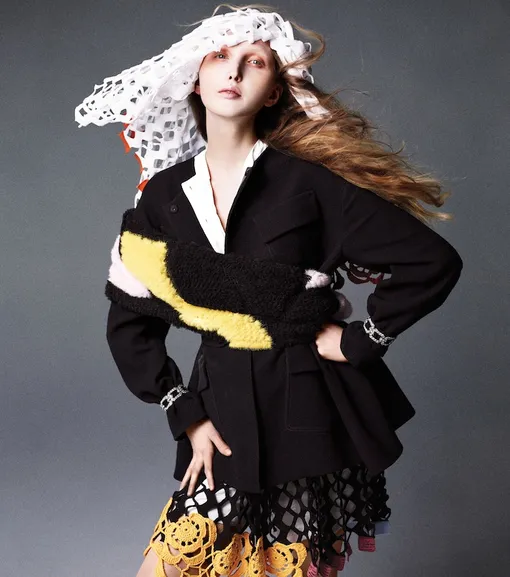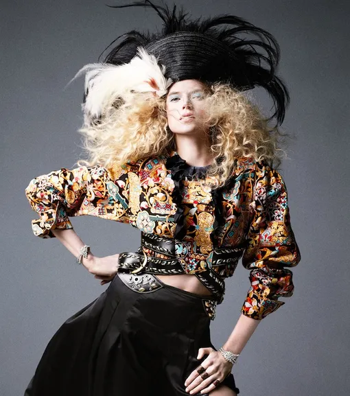 На Габриэлле: жакет, топ и юбка, Prada; корсет, Cadolle; колье, Harry Winston; шляпа, Vivienne Westwood Worlds End; перо, The Feather Place.