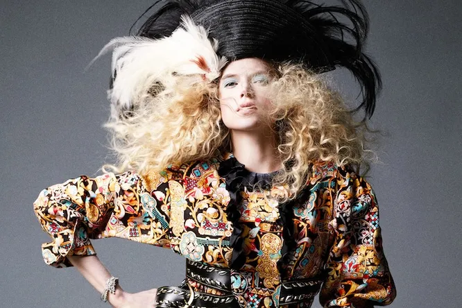 На Бентли: пальто, топ и серьги, Balenciaga; блуза (на голове), Nili Lotan; колье (на шее и на шляпе), Van Cleef & Arpels; шляпа, Vivienne Westwood.