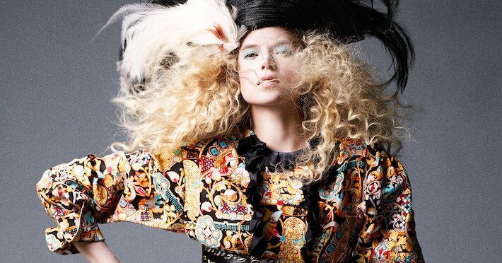 На Габриэлле Уайлд: топ, юбка и кольца, Louis Vuitton; браслеты, Harry Winston; шляпа, New York Vintage; аксессуар для волос (на шляпе), Ellen Christine Couture.