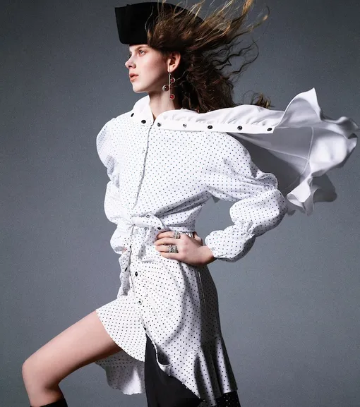 На Элли: платье, топ, юбка (надета как кейп), серьги и сапоги, J.W. Anderson; кольца, Chrome Hearts; шляпа, Jeff Mackay.