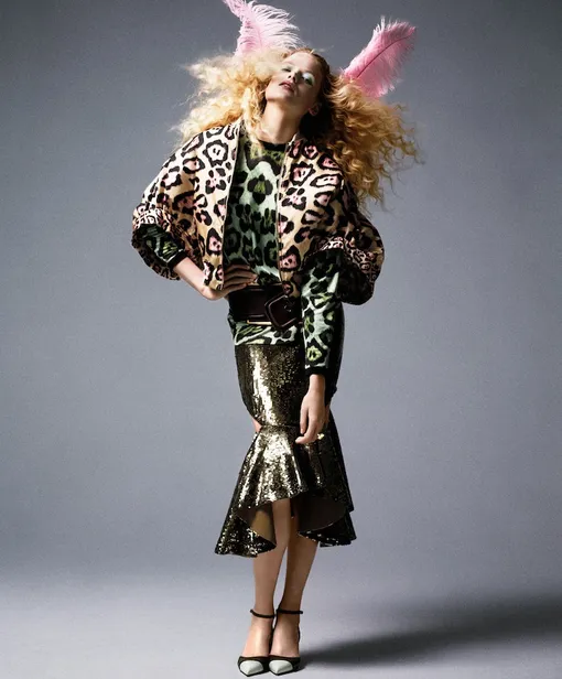 На Габриэлле: жакет, топ, юбка, и туфли, Givenchy by Riccardo Tisci; пояс, Givenchy, New York Vintage; кольцо, Harry Winston; перья, The Feather Place.