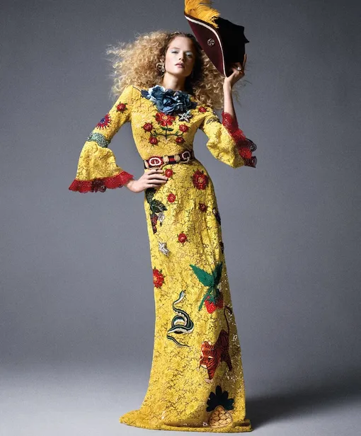 На Габриэлле: платье, Gucci; серьги и кольцо, Harry Winston; шляпа, Jeff Mackay; перо, The Feather Place.