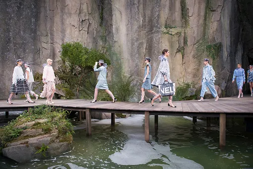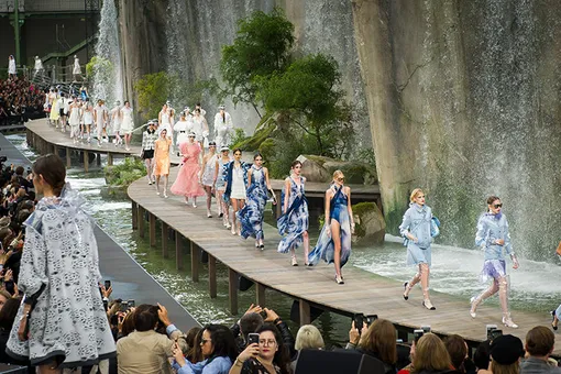 Заключительный день Парижской недели моды открыл показ новой коллекции Chanel, для проведения которого Карл Лагерфельд по традиции выбрал площадку Гран-Пале. Это, пожалуй, единственное, что дизайнер сделал по традиции. В остальном французская классика не выстояла под натиском волны деконструктивизма, прокатившейся по миру моды. Номинально на подиуме под водопадами в скалах, которые выросли здесь с легкой руки Лагерфельда, весь обязательный «набор Chanel»: маленькие черные и большие белые платья, твидовые жакеты и двухцветные two-tone boots, шляпы канотье и сумки на цепочке, но каждый из этих предметов теперь выглядит совсем иначе. Твидовый жакет дизайнер выращивает до макси-сайза в эстетике дадкор либо удлиняет его, превращая в платье-смокинг, и распускает нитку по периметру, декорируя бахромой. Классическую юбку-карандаш он представляет в виде гибрида джинсовых шортов и мини или же заменяет ее велосипедками, а коктейльные платья с оборками и перьями по подолу покрывает пластиковым футляром-дождевиком, какой выдают туристам на водопадах.