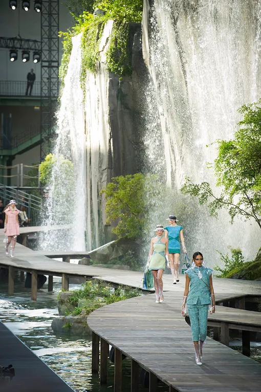 Деконструкция классического гардероба Chanel под водопадами в зеленых скалах