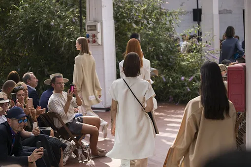 В новой весенне-летней коллекции Jil Sander заметно, как Мейеры расправляют крылья в поисках более разнообразных фасонов и оттенков, не выходя за рамки любимой ими лаконичности, доведенной до совершенства. Найти что-то лишнее или, наоборот, недостающее в образах просто не получится. Если это брюки и куртка, то максимально простого кроя, в сочетании с геометричной сумкой и лодочками. Если широкая оверсайз-рубашка, то в паре со шлепанцами на платформе: как будто вне друг друга они будут смотреться просто негармонично. Если это трикотажные обтягивающие юбки и кофты, то и обувь сделана в виде чулка, чтобы не нарушить единую форму всего образа. Добавляются и интересные детали: «рифленые» материалы, легкие, почти невесомые ткани, глубокие вырезы с воротником-стойкой, полупрозрачные носки и вышивка. Мейеры как будто нащупали почву и теперь понимают, куда нужно двигаться.