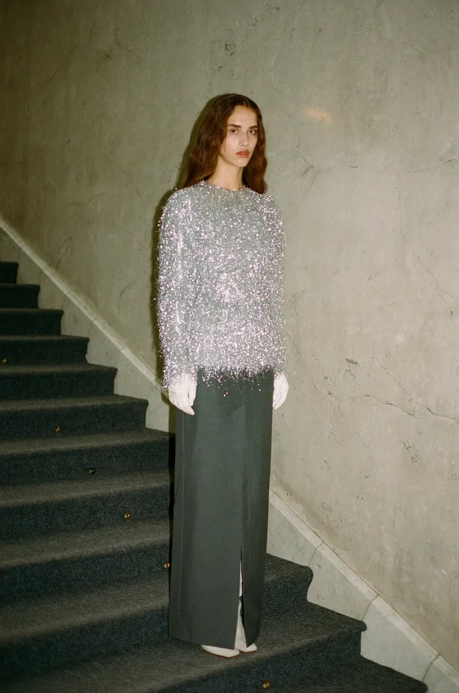 Еще одним источником вдохновения для дизайнера стал стиль башкирских эстрадных звезд 90-х и нулевых с их яркими, блестящими костюмами. Отсюда — множество блестящих фактур. Например, платья, пальто и топы из ткани, напоминающей серебряную елочную мишуру. Или платья и топы из хлопка, покрытого серебряным напылением, из-за которого все вещи приобретают трехмерный эффект, а силуэты выглядят более объемными и сложными. Особое внимание было уделено принтам. Один из принтов пришлось воссоздавать по детальным изображениям древнего башкирского платка, который Андрей Артемов снимал на телефон в Уфимском Музее археологии и этнографии.
