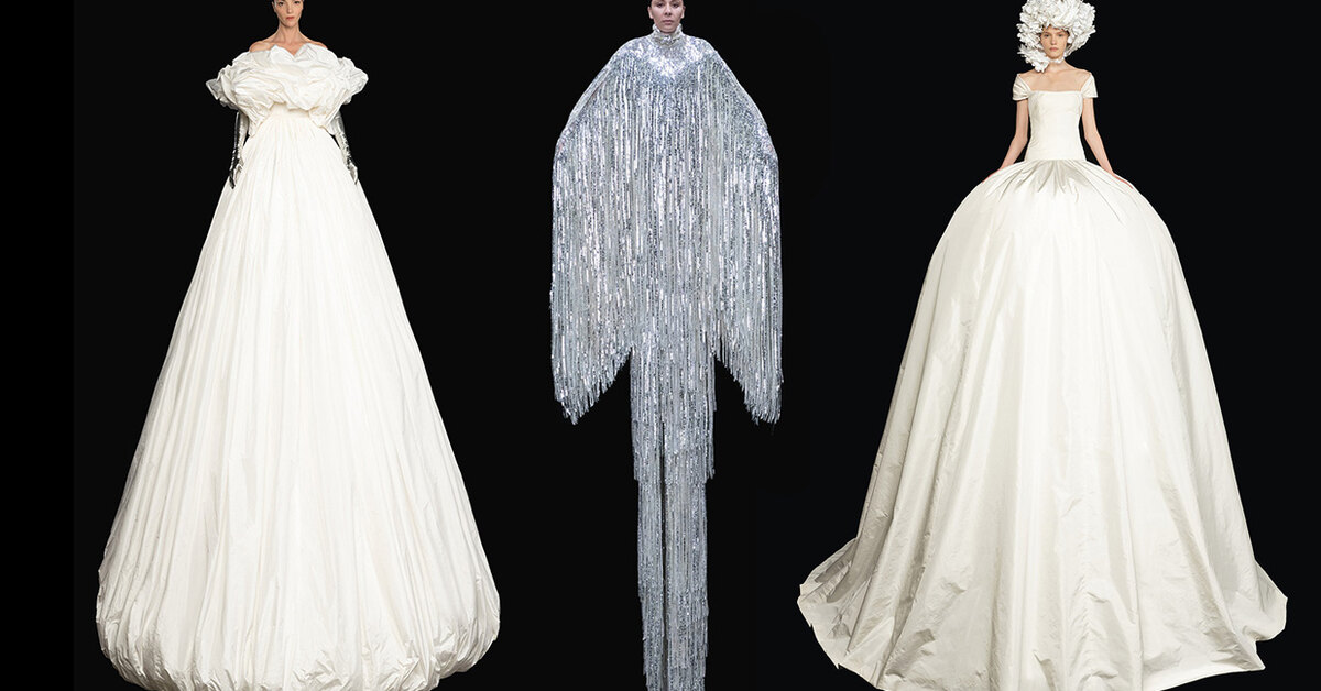 Но и без спецэффектов наряды оказались захватывающими. Пиччоли верен себе — он играет с формами, текстурами и слоями, скрещивает воланы, пайетки, перья, вышивку и банты, но делает это с изяществом (или «с благодатью и светом»).