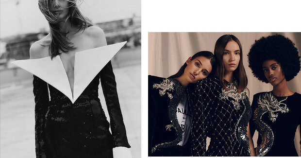 Новая коллекция Оливье Рустена разделена на несколько частей. С одной стороны, дизайнер нашел вдохновение в культуре Востока: вышивка на многих нарядах напоминает традиционные татуировки и гравюры, пайетки на платьях создают иллюзию драконьей чешуи. Здесь же комплекты из денима, простые белые сорочки и стеганые костюмы — классика Balmain. Заметны также бархатные юбки, блестящие мини-платья из пайеток, пышные блузки с оборками, трикотажные кофты с плечиками — отработанный и узнаваемый набор самого Рустена.
