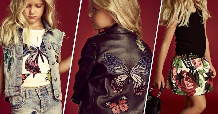 Панк-эстетика в весенне-летней коллекции Philipp Plein подчинена детским мотивам: яркие бабочки, звезды и цветы на миниатюрных байкерских куртках, футболках и вещах из денима придадут юным поклонникам бренда брутальный и яркий вид.