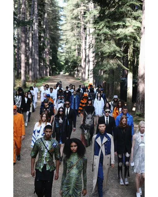 Основным источником вдохновения для Тиши в этот раз стала природа — вовсе не удивительно, если учесть, что он провел весь карантин в своем доме на озере Комо и активно наслаждался местными живописными пейзажами. Сам показ прошел в лесу, и «зрителями» на нем были лишь безмолвные деревья. В вещах же прослеживалось множество разнообразных отсылок к морю и его обитателям: рыбацкие сапоги, резиновые плащи, принты с изображением русалочьих хвостов, драпировки в форме раковин на платьях и баски, напоминающие по форме хвосты рыб. И, конечно, самый морской цвет — синий: примерно в половине выходов показа был по крайней мере один элемент в самых разных его оттенках.