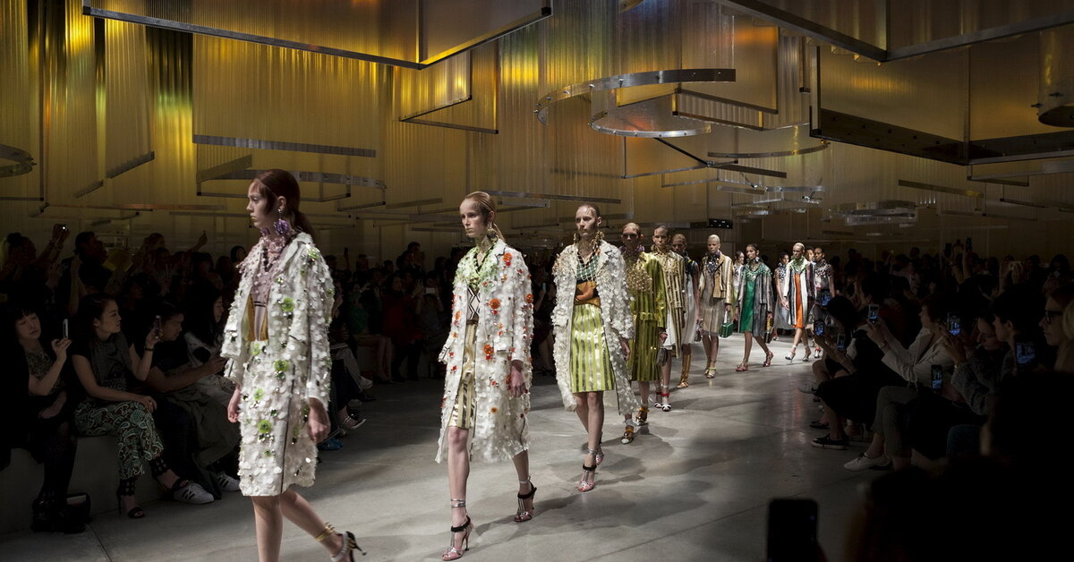 Миучча Прада открыла свой показ образами, выдержанными в особом варианте приема color blocking: нейтрально-серая клетка в них «сражается» с гармонирующими по цвету узорами или однотонными элементами. Появление на подиуме главной гордости грядущего весенне-летнего сезона – вертикальной цветной полоски – предварила изящная графика на платьях, юбках и пиджаках. Аккуратные короткие штрихи, казалось, нанесенные на полупрозрачные ткани цветным карандашом, сменились плотными и активными принтами – с полосками дизайнер так разыгралась, что обеспечила Prada около двух десятков модных образов. В следующем сезоне именно на ней будет строиться гардероб тех, кто с восторгом встречает каждый показ Дома. Носить такую полоску можно с чем угодно – Миучча Прада на миланской Неделе моды предложила лучшие варианты.