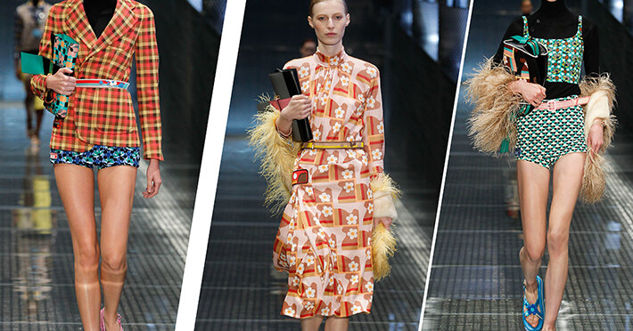 Не стоит обманываться на счет Миуччи Прады: она не из тех, кто будет разжевывать для зрителя свои коллекции, выдавая на их суд удобоваримый материал. То, что по всем законам жанра считается традиционно красивым, в ее исполнении получает сложную интеллектуальную огранку – именно так в свое время сложился ее фирменный стиль «ugly chic», с которым сегодня работает добрая половина дизайнеров. Цветные перья марабу в духе 1920-х (не зря ведь Миучча Прада участвовала в создании костюмов для экранизации «Великого Гэтсби» База Лурмана) идут у нее рука об руку с рубашками в графичный принт не то из 1940-х, не то из 1960-х, а следом за ними – нарочито топорно сделанные спортивные топы, шорты и юбки а-ля «Олимпиада-80». Однако отчетливее всего в весеннее-летней коллекции Prada слышатся отголоски ранних 1970-х, которые еще не отошли от молодежной свободы предыдущего десятилетия, но еще не ворвались в безудержный диско-угар. В том и заключается вся прелесть коллекций этого бренда – их изучаешь, пытаешься распробовать, смакуя каждую деталь, и углубляешься все дальше в глубины творческого подсознания дизайнера.