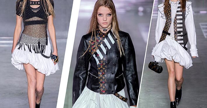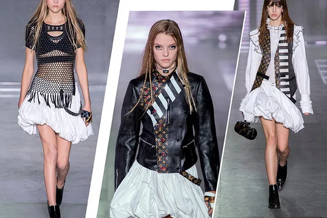 Высокотехнологичный дивный новый мир, который показал нам в этом сезоне Николя Жескьер, кажется, так и просит, чтобы его разобрали на детали. Тем более что их в коллекции бесконечное множество. Тут и сложное плетение топов-сетей, и позаимствованная из промышленного дизайна лазерная резка, и несколько типов вышивки (крестом и гладью, стеклярусом и бисером), и неожиданные кожаные вставки. Кажется, будто свою вселенную Жескьер собирает из разновременных и разностилевых обломков, оставшихся после мировой катастрофы. Эта концепция отлично вписывается в общую пост-апокалиптическую эстетику, которую дизайнер взял на вооружение уже несколько сезонов назад и сейчас довел до логического завершения, сделав звездой весенне-летней рекламной кампании Louis Vuitton Молнию — воинственную героиню компьютерной игры Final Fantasy.