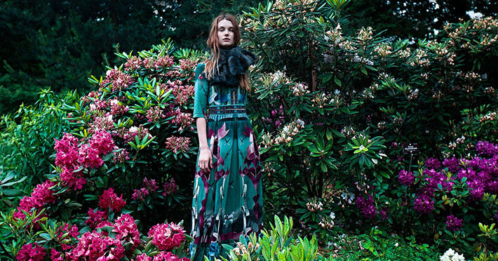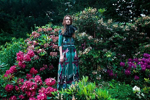 На создание осенне-зимней коллекции Алену Ахмадуллину вдохновила новелла «Кентервильское привидение» – с легкой руки дизайнера мистическая история, сочиненная Оскаром Уайльдом, материализовалась в элегантных нарядах со сложными вышивками и драпировками. Главные хиты – закрытые длинные платья актуальных оттенков зеленого, брючный костюм с удлиненным жакетом, меховые накидки – можно увидеть в новой рекламной кампании бренда. Ну а фоном для съемки стали не сумрачные интерьеры, как можно было бы предположить исходя из сюжета сказки, а рассветный сад: модели позируют в зарослях рододендронов и папоротников, какие запросто могли бы окружать замок Кентревиль.