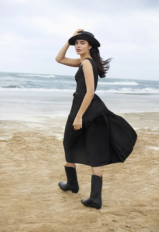 Часть коллекции посвящена ковбоям-гардианам из Арля. Этот городок в Провансе вдохновлял своим драматичным светом еще Пикассо и Ван Гога – отсюда вещи будто с мужского плеча и контрастное сочетание черного и белого. Затем Инес обращается к 1920-м и смелым женщинам, которые не боялись отстаивать свои права и свободы. Если сейчас летящие платья с заниженной линией талии для нас являются нормой, то век назад модницам пришлось за них побороться. И все-таки без Парижа в коллаборации не обошлось: модный триптих Инес завершает мини-линейка спортивной одежды, трикотажа Tilden и брюк джерси – читайте в них отсылку к форме атлетов на летних Олимпийских играх 1924 года, которые проходили в столице Франции.