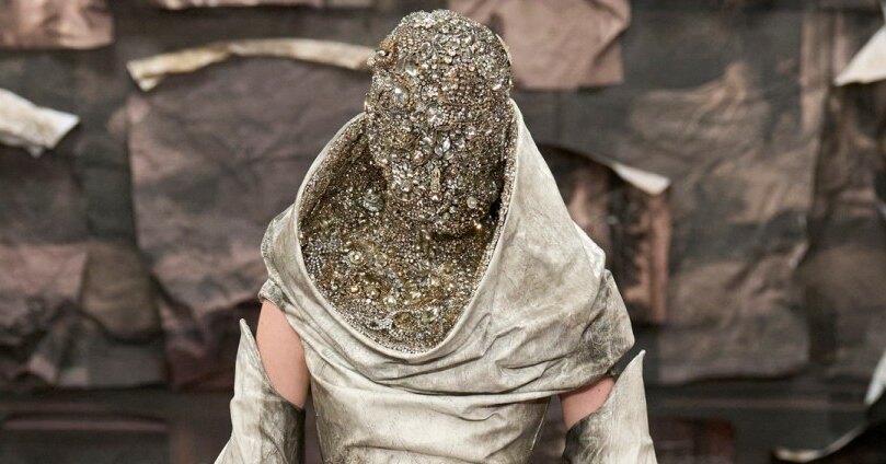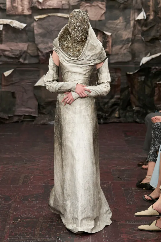 Гленн Мартенс принял решение углубиться в наследие создателя Maison Margiela и использовать один из самых узнаваемых кодов бренда — маски, закрывающие лица моделей. Эта деталь, придуманная самим Маржелой, смещает фокус внимания от людей к одежде. Сквозь призму видения нового креативного директора они приобрели самые разные переосмысления — начиная от полупрозрачной тюли, заканчивая инкрустированными кристаллами. Еще один реверанс в сторону наследия Мартина — пластиковое платье, которое вчера открыло дебютное шоу. Оно было вдохновлено бодисьютом из коллекции 1992 года, которое предвосхитило моду на просвечивающие вещи задолго до «голого» тренда.