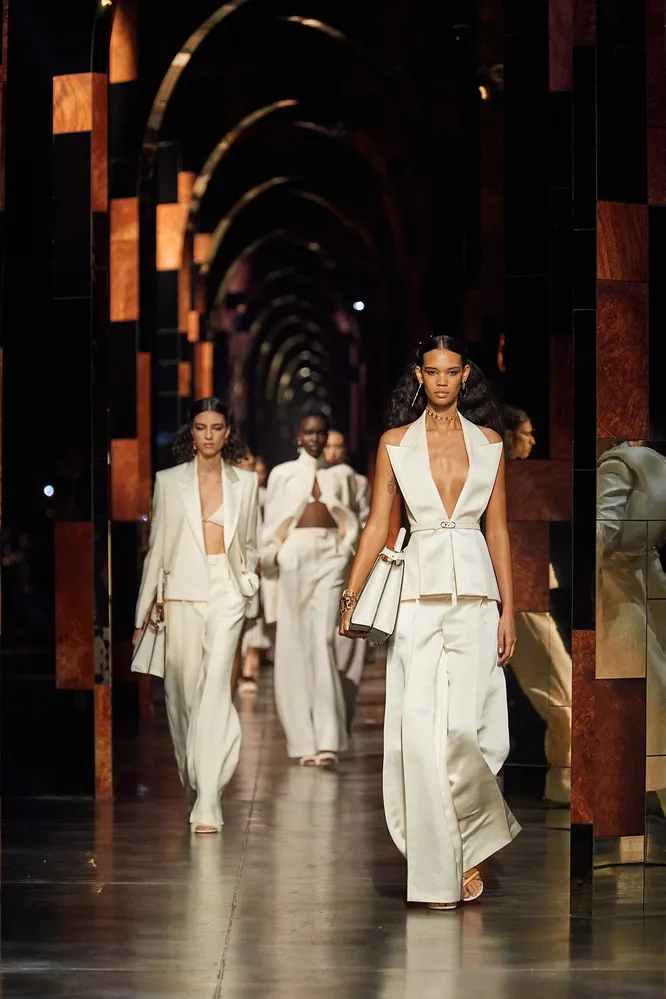 Работы Лопеса Ким Джонс процитировал довольно буквально — он превратил их в яркие принты на летящих шелковых платьях, в которых вполне могли бы кружиться на танцполе Studio 54 Дайана Росс и Бьянка Джаггер. При этом вся яркость коллекции раскрывается постепенно — лишь к середине шоу. У креативного директора Fendi очень интересная манера работы с цветом: он любит выпускать моделей на подиум группами в тотал-луках одной цветовой гаммы, чтобы доминирующие оттенки плавно сменяли друг друга, как в градиенте. Сначала он «разогревал» зрителей однотонными белыми образами, потом — бежевыми, и вот так, через полутона, дошел до очень ярких оттенков розового и графичных принтов. Затем цвет снова пошел на убыль — но уже в обратном направлении, от ярких цветов через светлые — и до темно-коричневого и черного. Кроме того, любопытными оказались и аксессуары — особенно миниатюрные сумки-браслеты, которые можно надевать прямо на запястье (все еще думаете, что дни микросумок сочтены? Зря!). Разумеется, нашлось в коллекции место и ридикюлям Fendi First с ручкой в форме буквы F: если верить пресс-службе римского Дома, она уже стала настоящим бестселлером. А значит, ее разные вариации мы увидим еще не раз.