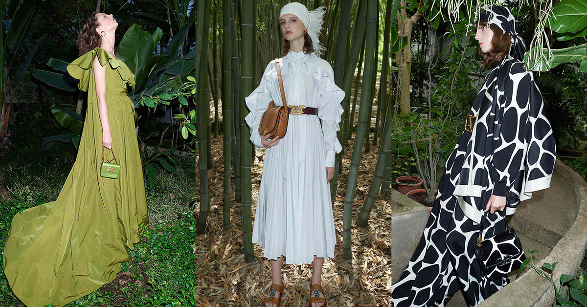 Главные изюминки коллекции — нетипичные анималистичные принты (например, жирафовый), аксессуары с узнаваемой буквой V, обилие перьев и шелковые повязки на голову, которые будут спасать от солнца и добавлять любому образу колорита. Кстати, о головных уборах: Пьерпаоло Пиччоли также предлагает носить широкополые шляпы будто из 70-х — конечно, в сочетании с элегантными кейпами.