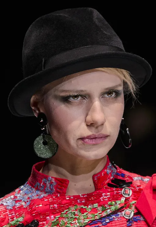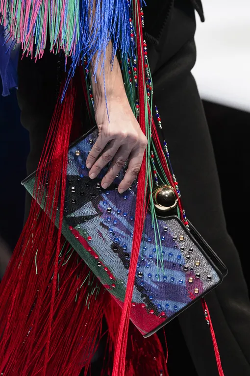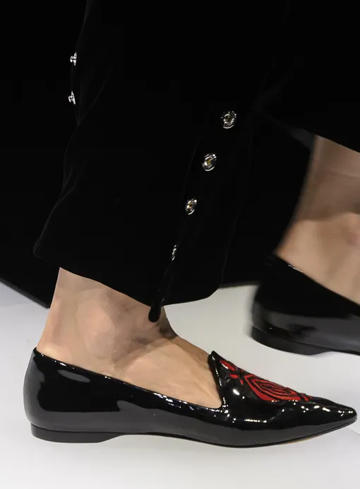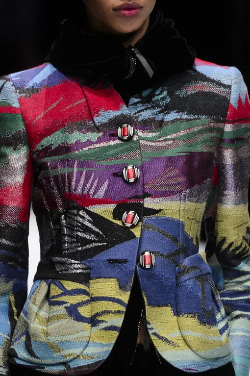 На подиуме тут - породистые дамы со страниц журналов 1980-х в ярких квадратных пальто, зауженных брюках, коротких точеных жакетах с контрастными лацканами, цветных бусах, крупных серьгах и беретах. Здесь же бархатные костюмы с широкими брюками и короткими топами-жилетами, расшитыми камнями, комбинезоны с баской и накидкой, перекинутой через одно плечо, блеск люрекса и платья в пол с асимметричным узорчатым корсажем. Все, кто не выбрал эти шелка с отливом, жесткие драпировки и кристаллы для появления на «Оскаре», кусайте локти.