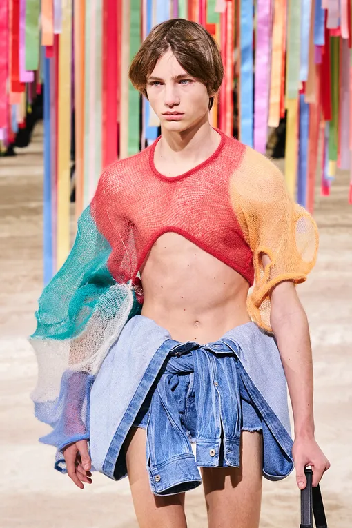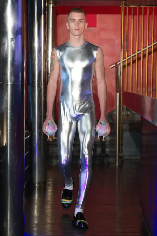 К этой же обуви, которую нам по-прежнему привычнее видеть на женщинах, чем на мужчинах, обратился и Джонатан Андерсон. Мэри Джейн JW Anderson — массивные, на утрировано толстой подошве. В остальном же дизайнер решил, как и Сильвия Вентурини-Фенди, работать с атрибутами «старой» маскулинности. Например, с рубашками поло, которые он усыпал сияющими пайетками и превратил в комбинезоны и мини-платья (для большего эффекта в аналогичных на показе прошлись и мужчины, и женщины). Но настоящими звездами коллекции стали клатчи-голуби, которые «завирусились» еще до показа: видео с такой сумкой набрало больше 100 000 просмотров на странице бренда в инстаграме (Социальная сеть признана экстремистской и запрещена на территории Российской Федерации). Продолжил дизайнер взятый в собственной марке курс и в Loewe: майки-алкоголички, всегда бывшие мачо-атрибутами, он превратил в кокетливые облегающие топы, усыпанные сверкающими светодиодами, а на балаклавах и свитерах вырезал наивные сердечки. Без вирусного контента тоже не обошлось: чего стоят только морские раковины вместо сумок, принты со сливными отверстиями на футболках, светящиеся рукава пиджаков, бесконечно длинные пальцы вязаных перчаток и... серое пальто с золотыми отпечатками ягодиц сзади. В общем, Андерсон подкинул работы авторам модных инстаграм-аккаунтов и телеграм-каналов: все старались запостить его новые вещи как можно быстрее, чтобы собрать побольше лайков и удивленно-восторженных комментариев.