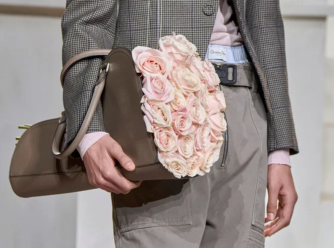 Пожалуй, единственным, кто решился буквально «подарить» мужчинам конвенционально женственные атрибуты, стал Вирджил Абло. В своей прощальной коллекции для Louis Vuitton он сделал и многослойные юбки из тюля, и бейсболки с длинными вуалями, и даже один лук с белоснежным кринолином (практически выход невесты, но с учетом перемен в гендерной парадигме: теперь фата и кринолин полагается не только девушкам). Ким Джонс в Dior Men пошел по несколько иному пути: он процитировал несколько весьма узнаваемых образов из архивов Дома (например, кожаную куртку с мехом из знаменитой коллекции Beatnik 1960 года, которая стоила Иву Сен-Лорану работы), но «перевел» их на язык мужской моды так, что ни у кого не повернется язык назвать их женственными. Даже несмотря на кокетливые вырезы на спинах джемперов, сложные фигурные драпировки на пиджаках, усыпанные цветочными вышивками накидки-горжетки и трогательную охапку зефирного оттенка роз, выглядывающую из сумки.