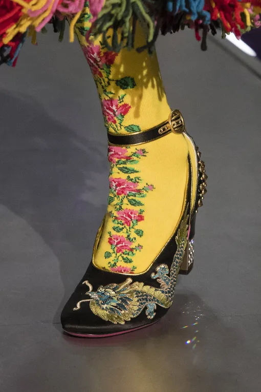Шутка ли, зрители увидели 120 луков. И каждый из образов в этой фарсовой, бутафорской «цирковой реквизиторской» - лютое нагромождение стайлинговых мелочей. Каждый из ансамблей дизайнер создает мелкими штрихами, до предела насыщая их «стечением» фактур, принтов, красок, форм и аксессуаров. А с учетом всеобъемлющей темы показа — история человечества от сотворения мира до наших дней, — единственное, что остается сказать об этом шоу: «Все смешалось в Доме Gucci». Бабочки, тигры и зайцы, драгоценные слэйвы и россыпи перстней, банты и пирсинг, трости и стрелы, плетеные корзины и придворные шелковые туфли, космические маски-чулки и исторические треуголки, серпы и молоты...