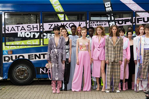 Если в прошлых коллекциях Наташа Зинько черпала вдохновение в 80-х, то для нового весенне-летнего показа 2019 ее интерес плавно перетекает в следующее десятилетие. А точнее, в авангардную уличную моду 90-х. Сразу бросаются в глаза вещи из денима, характерные для того времени: трехцветные (белого, голубого и темно-синего оттенков) бермуды, джинсы и куртки. Некоторые предметы — платья, рубашки, юбки и пальто — будто сварены в разных красках, хотя раньше такой дизайнерский прием проделывали лишь с джинсами. Часть коллекции выполнена в неоново-зеленом цвете, который в 90-е любили киберготы, поэтому неудивительны и футуристичные элементы — перламутровый плащ и ботильоны. Антуража всему показу добавляет то, что он проходил на улице на фоне яркого автобуса с тегами, который как будто бы отвезет всех моделей в их драйвовых нарядах на стилизованный рейв.