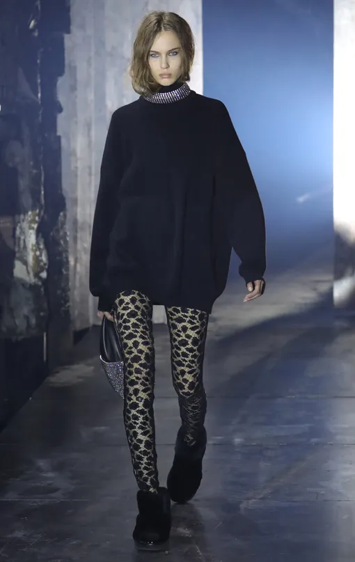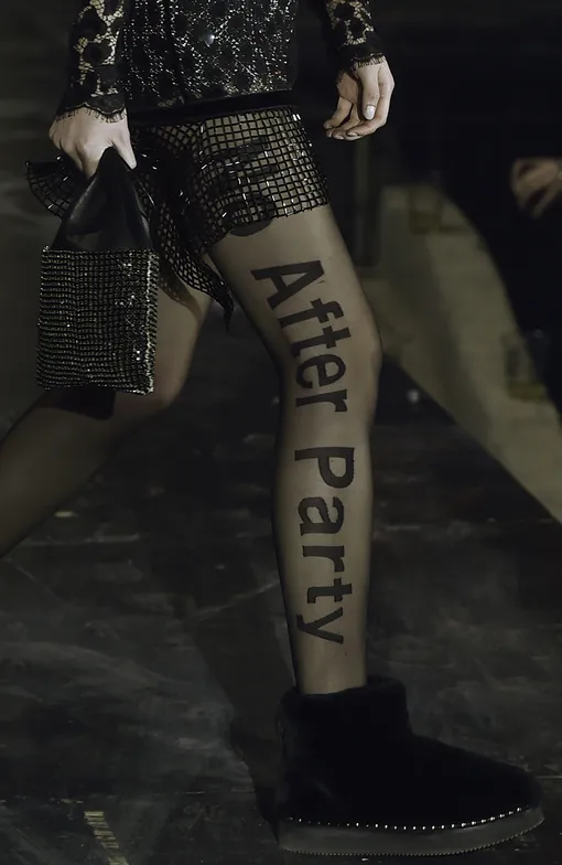 Во-первых, король вечеринок на этот раз «с порога» заявил гостям, что афтепати не будет, написав на приглашениях No After Party. А чтобы не отвечать на уточняющие вопросы, продублировал надпись на капроновых чулках моделей. No After Party-колготы не единственная разновидность капрона в коллекции. Сетка, повторяющая орнамент змеиной кожи, пятнистые «леопардовые» чулки и плотные черные легинсы прилагаются.