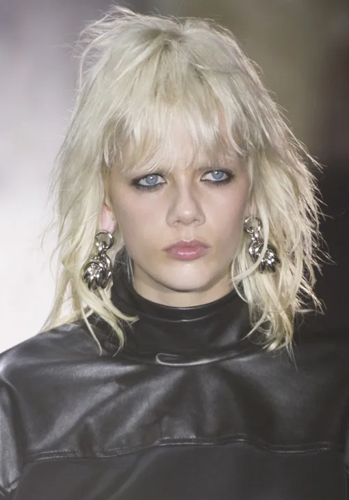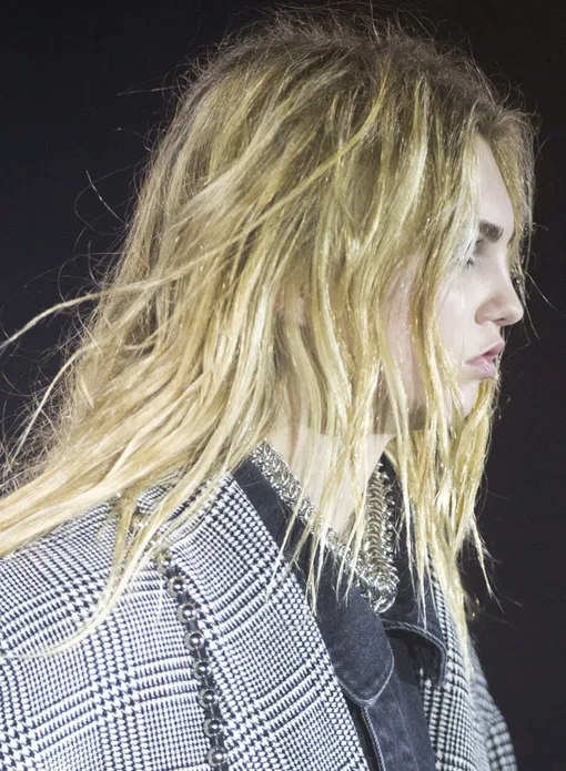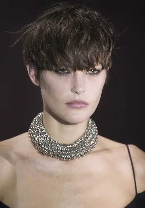 В этот хард-рок предсказуемо вписываются стрижки пикси из фотохроник 1990-х с Линдой Евангелистой (спасибо Гидо Палау), взъерошенные «непричесанные» волосы и черная подводка по внутреннему веку.