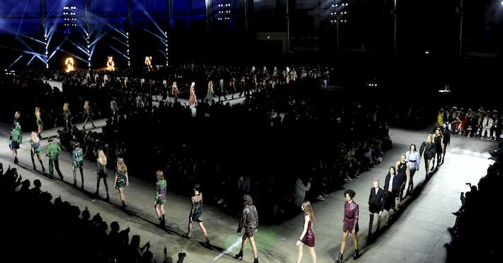 Весенне-летняя коллекция Versace погружена в тона хаки и животные принты: леопарду или зебре Донателла Версаче придаёт особенно буйный вид с помощью ярко-зеленого, желтого и фиолетового. Перекликаясь с Roberto Cavalli в платьях со шлейфом, а также выпуская на подиум несколько моделей в облегающих вещах с глубоким декольте и разрезами, дизайнер быстро одергивает свою тягу к глянцу и роскоши: обновленный Versace тяготеет к минимализму, милитари, даже классике, но все равно не теряет своё лицо.