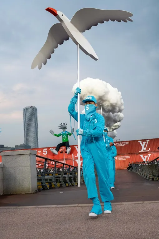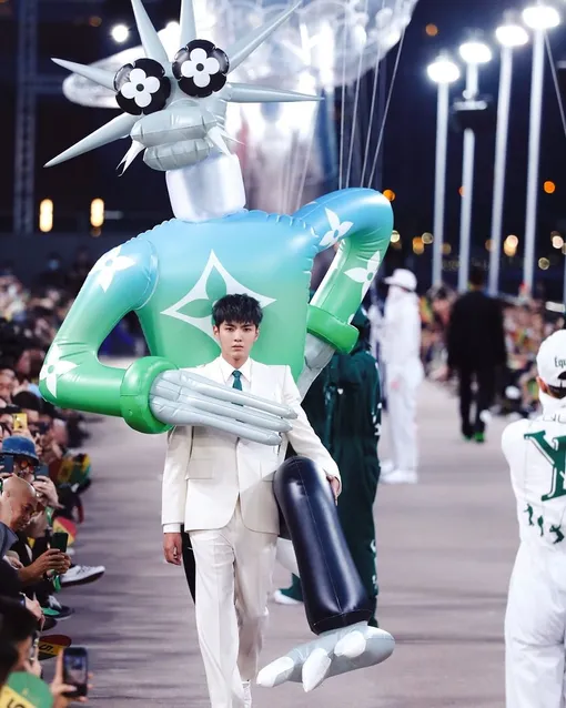 На этот раз показ закрывал актер Крис Ву, неся в руках огромного надувного дракона из Zoooom with friends. «Все люди нуждаются в покое, и мы надеемся, что красота подарит нам мир и положительную энергию. Именно об этом моя коллекция, которая направлена на то, чтобы продемонстрировать, что хорошего есть в этом мире, что способно заставить ребенка улыбнуться и доставить радость взрослому», — говорит Вирджил.