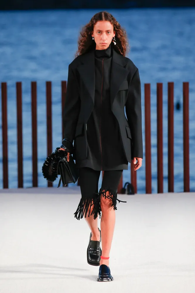 В новой коллекции марки появилось непривычно много ярких, «витаминных» цветов: апельсиновый, лимонный, огненно-красный, фуксия. Даже анималистичный принт «под зебру» у дизайнеров в этот раз получился не черно-белым, а цветным, практически в духе поп-арта. Это именно то, что нужно после года заточения в четырех стенах: такие оттенки кому угодно поднимут настроение. А вот в части силуэтов они остались верны сами себе: на подиуме мы увидели все, за что любим Proenza Schouler: объемную верхнюю одежду, облегающие трикотажные платья, брючные костюмы с приталенными жакетами, геометричные вырезы в самых неожиданных местах и летящие платья-кейпы. Интересной деталью стала бахрома, которая появилась и на многослойных трикотажных платьях, и на рукавах топов, и даже на велосипедках. Также дизайнеры вдохновились идеей отпуска на тропическом острове — отсюда в коллекции появились яркие тропические принты с цветами и листьями. Кастинг тоже заслуживал внимания: по подиуму прошлись молодая мама Джиджи Хадид и новая любимица дизайнеров — падчерица вице-президента США Камалы Харрис, Элла Эмхофф.