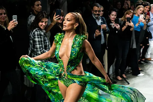 Юбилей тропического принта, появление Дженнифер Лопес и коллаборация с Google — чем запомнился показ Versace