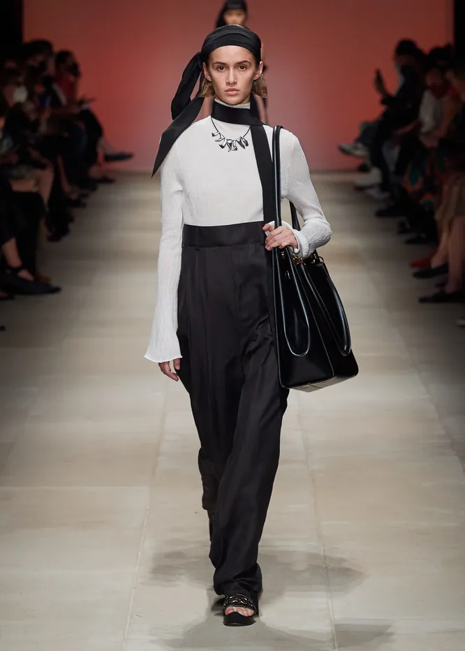 Коллекция Salvatore Ferragamo вышла спокойной и благородной. С преобладанием нейтральных оттенков: коричневого, бежевого, кремового, черно-белых образов. Видимо, это такое «затишье перед бурей»: напомним, что Пол Эндрю покинул пост креативного директора марки в мае, так что скоро начнется новая глава в истории бренда. А пока — красивые, но довольно нейтральные образы.
