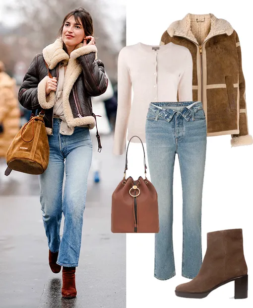 Кардиган N.PEAL, 18 239 руб.; джинсы ALEXANDER WANG, 19 887 руб.; дубленка NEIL BARRETT, 211 100 руб.; ботильоны BY FAR, 30 517 руб.; сумка MARNI, 105 059 руб.