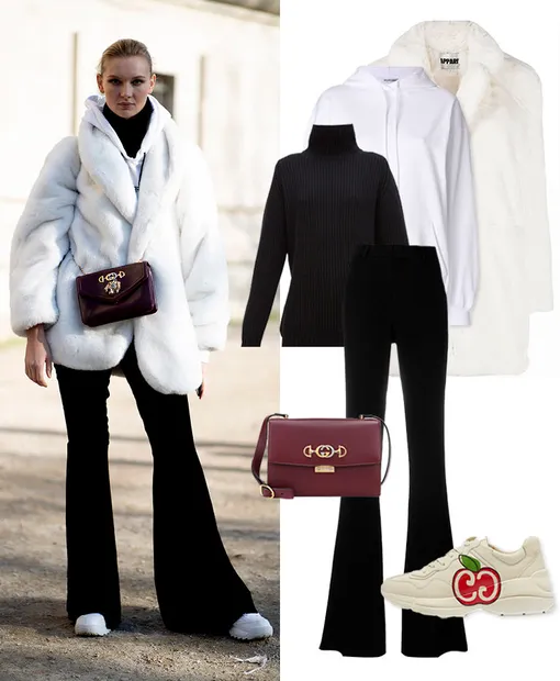 Худи BALENCIAGA, 52 773 руб.; водолазка HILLIER BARTLEY, 60 005 руб.; брюки GUCCI, 64 800 руб.; шуба APPARIS, 22 553 руб.; сумка GUCCI, 161 040 руб.; кроссовки GUCCI, 45 511 руб.