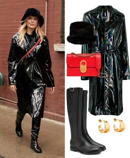 Плащ RAINS, 10 518 руб.; сережки SOPHIE BUHAI, 23 466 руб.; шапка EMMA BREWIN, 20 244 руб.; сумка CHRISTIAN LOUBOUTIN, 110 301 руб.; сапоги SERGIO ROSSI, 59 150 руб.