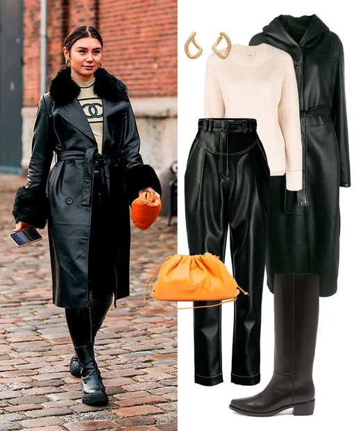 Пуловер 3.1 PHILLIP LIM, 31 227 руб.; брюки PHILOSOPHY DI LORENZO SERAFINI, 17 557 руб.; плащ LISKA, 194 157 руб.; сережки HUM, 256 775 руб.; сумка BOTTEGA VENETA, 56 555 руб.; сапоги LEGRES, 42 485 руб.
