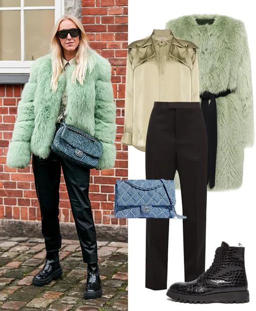 Блузка BOTTEGA VENETA, 47 369 руб.; брюки BOTTEGA VENETA, 55 062 руб.; шуба BLANCHA, 129 500 руб.; сумка CHANEL, 276 000 руб.; ботинки PRADA, 40 468 руб.