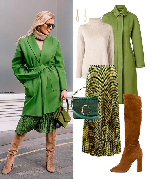 Свитер CHINTI & PARKER, 22 164 руб.; юбка JOSEPH, 20514 руб.; пальто BURBERRY, 175 000 руб.; сумка CHLOÉ, 69 441 руб.; сережки LIZZIE MANDLER, 122 279 руб.; сапоги SAINT LAURENT, 69 265 руб.