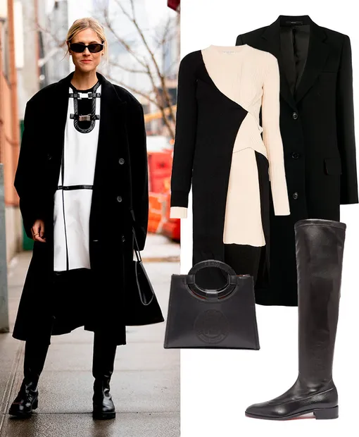 Платье BOTTEGA VENETA, 151 270 руб.; пальто PAUL SMITH, 62 359 руб.; сумка FENDI, 115 117 руб.; сапоги CHRISTIAN LOUBOUTIN, 82 126 руб.