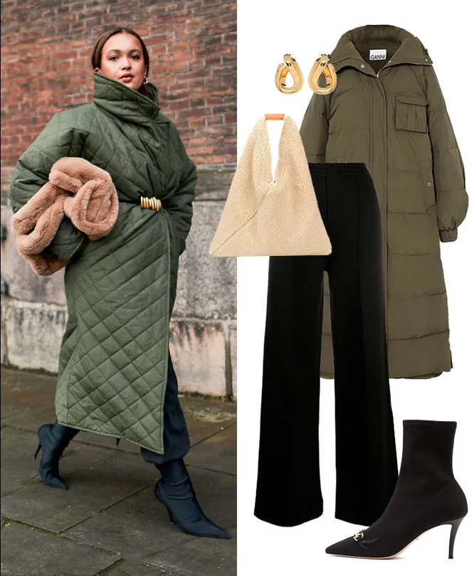 Пуховик GANNI, 28 241 руб.; брюки JOSEPH, 26 559 руб.; сережки BALENCIAGA, 19 181 руб.; сумка MM6 MAISON MARGIELA, 22 106 руб.; ботильоны GUCCI, 45 173 руб.
